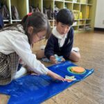 - 4/21の一コマ園庭に鯉のぼりがたなびいています!いただいたタケノコに興味津々!春一杯の鳴鼓幼稚園です!