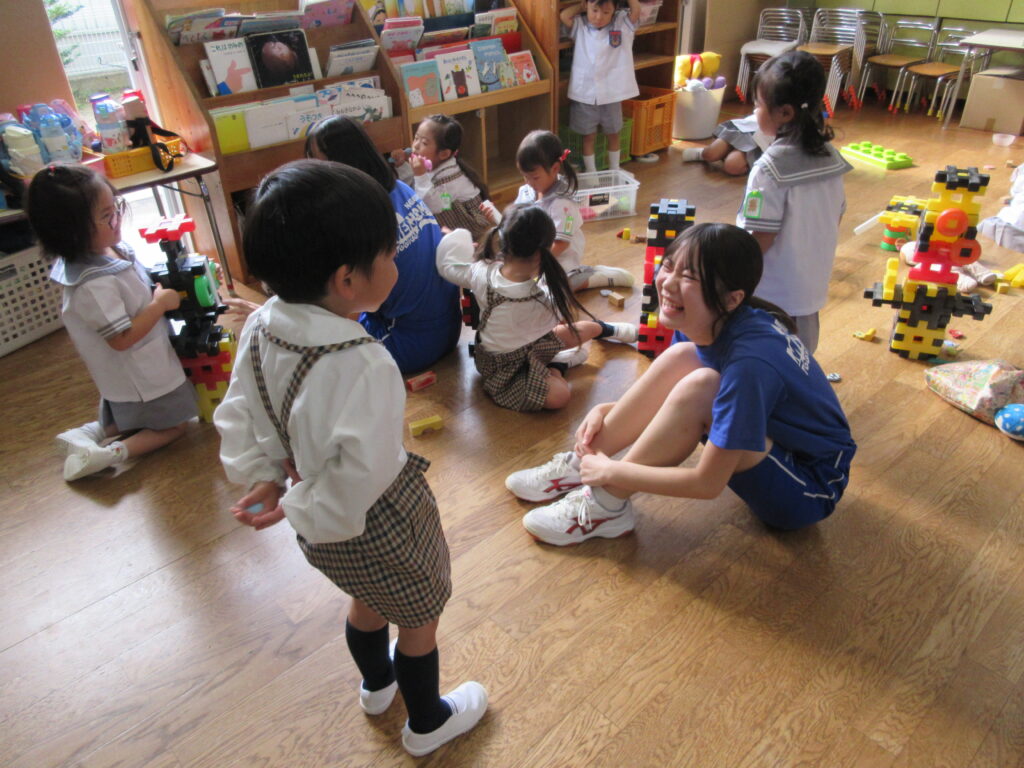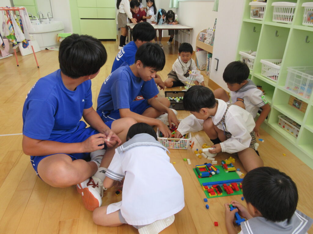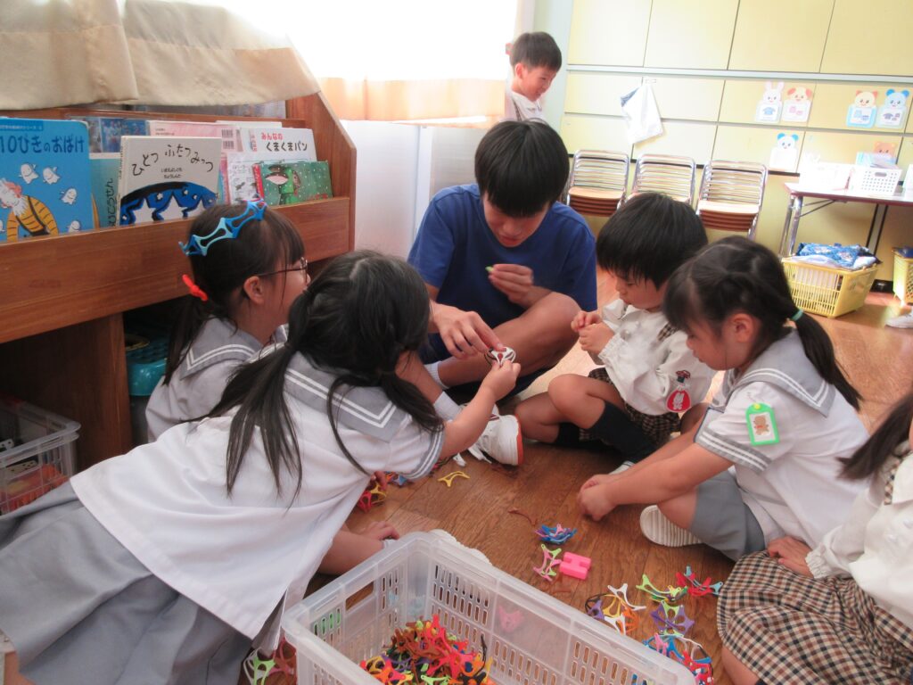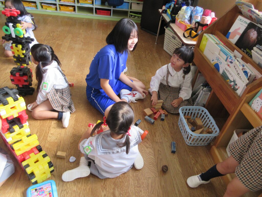 鳴北中学校の3年生16名が、総合的な学習の時間の保育実習で、幼稚園に来てくれました。代表の生徒さんが挨拶をして、各クラスに3~4名ずつ入って子ども達と触れ合いました。保育室のおもちゃで楽しく遊びました♪
