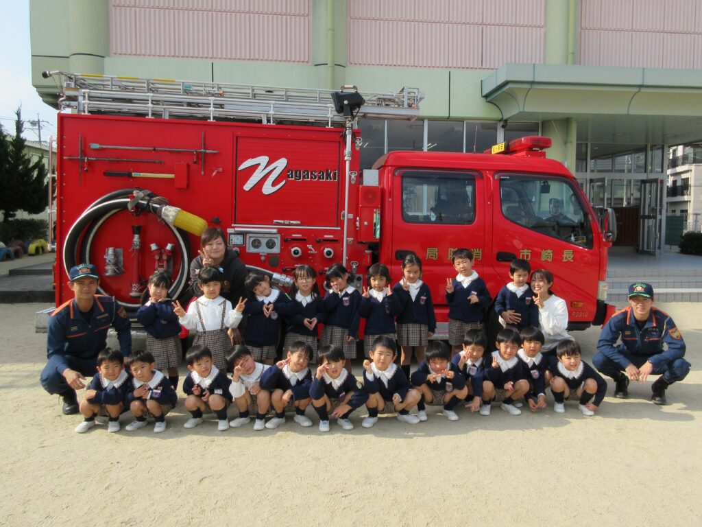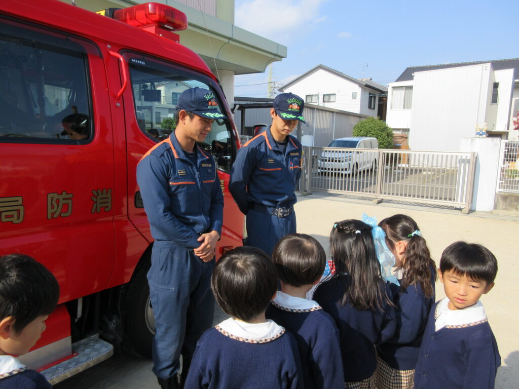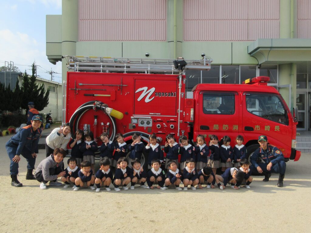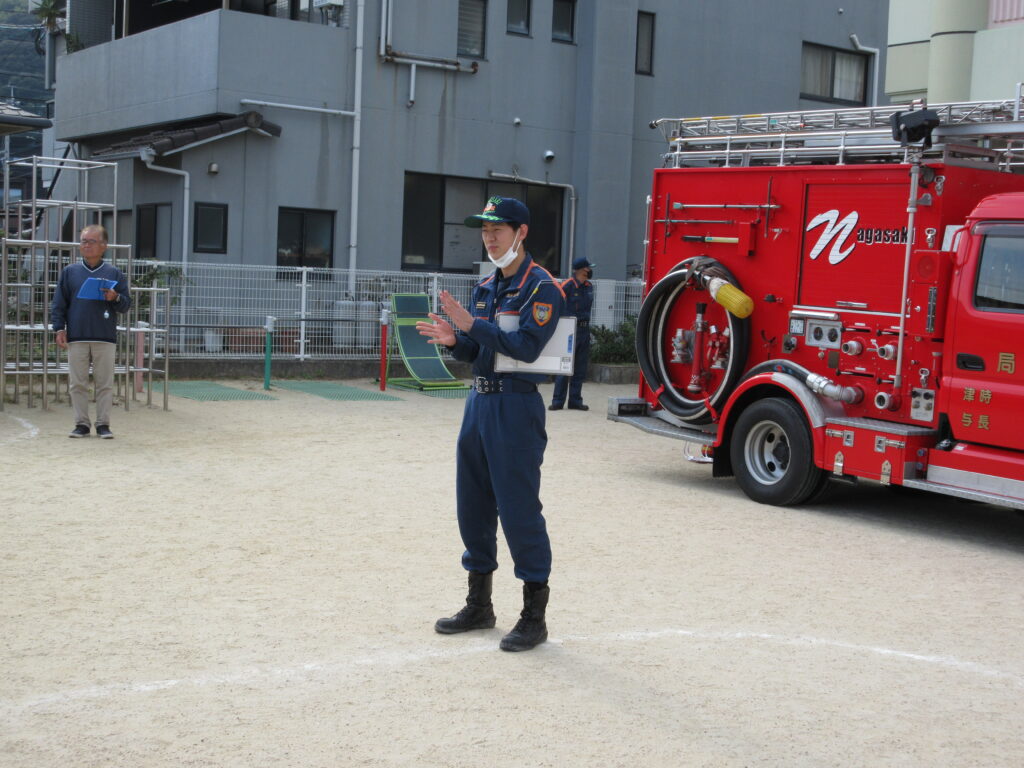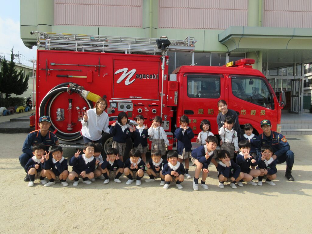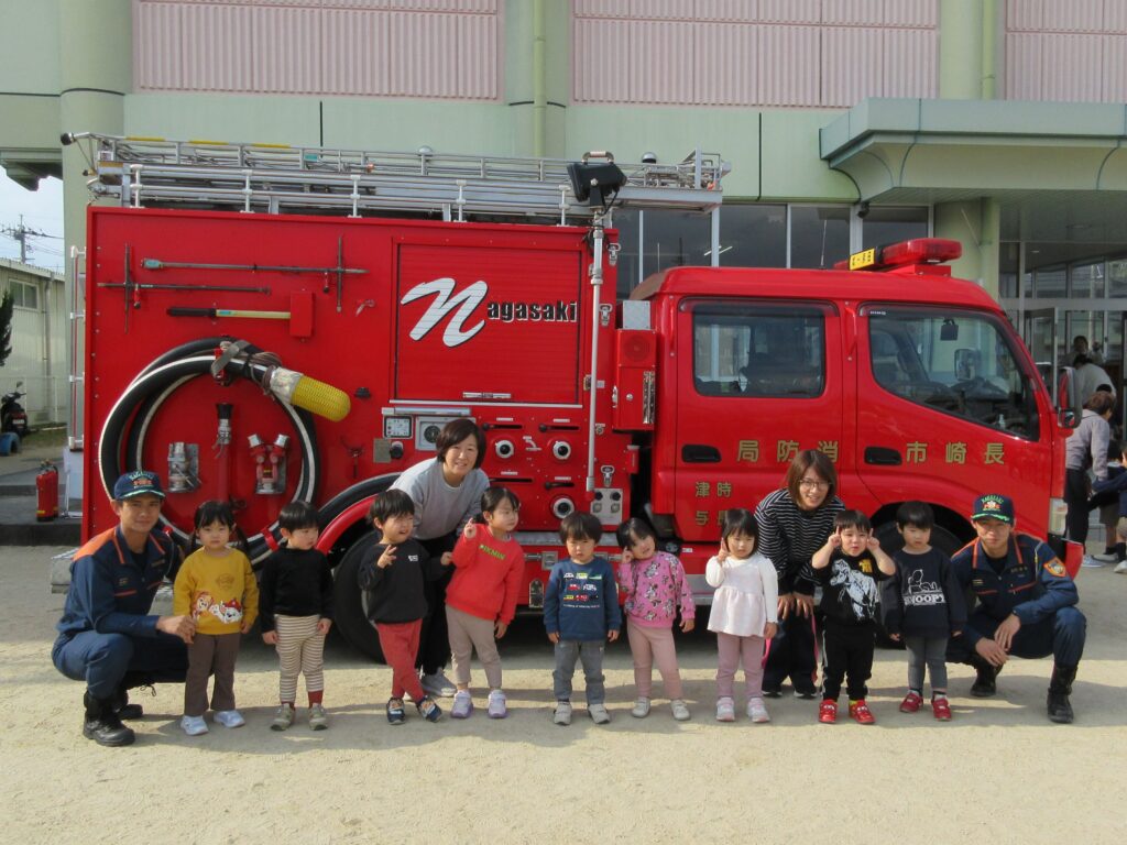 今日は、長崎北消防署浜田出張所の方に来ていただいて、火災の避難訓練を行いました。今回は、避難訓練をすることを子ども達には伝えていませんでしたが、落ち着いて避難することができました。