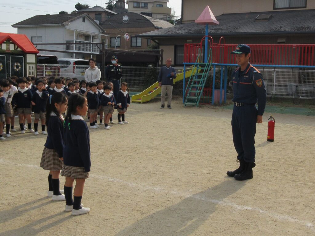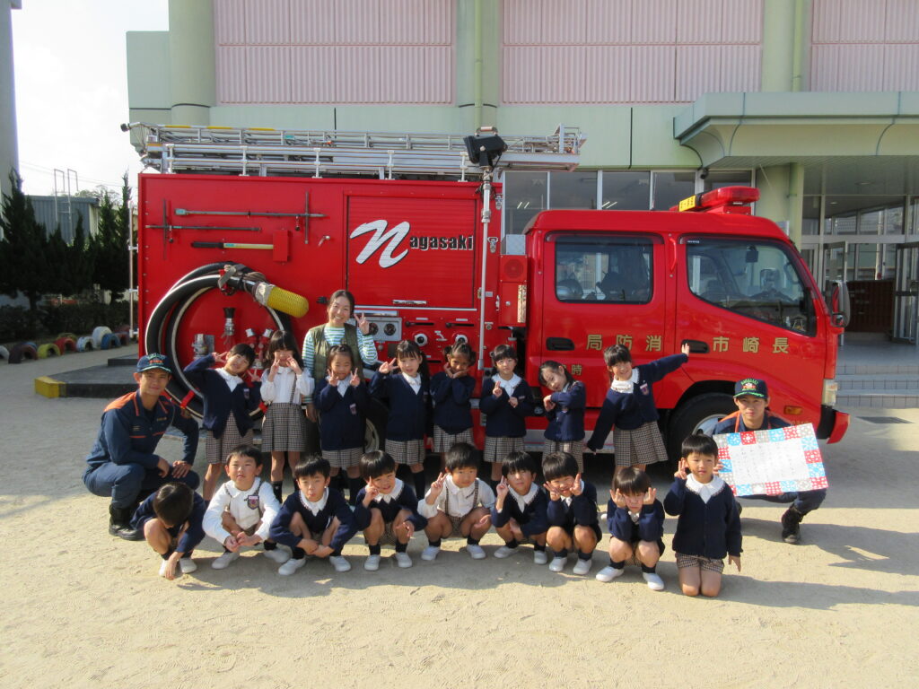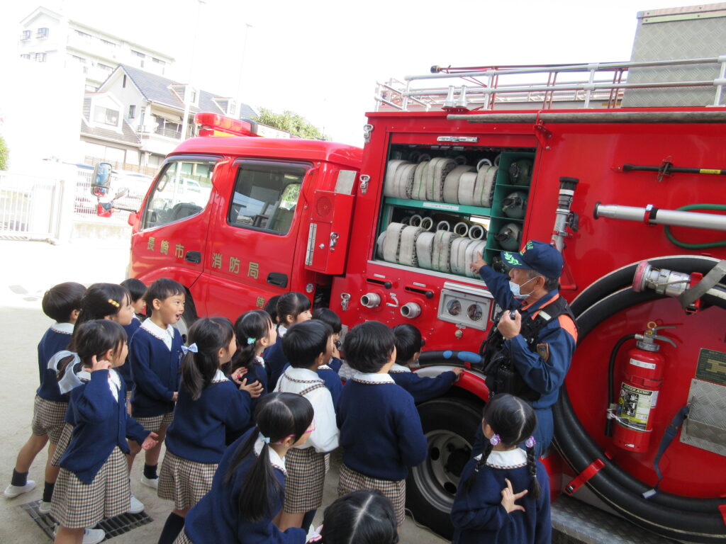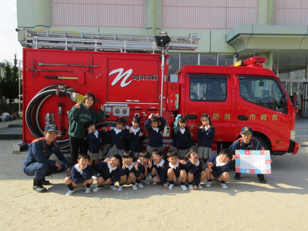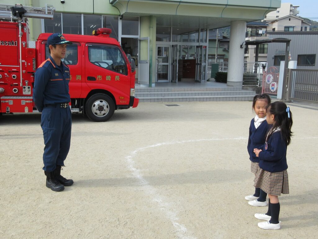 今日は、長崎北消防署浜田出張所の方に来ていただいて、火災の避難訓練を行いました。今回は、避難訓練をすることを子ども達には伝えていませんでしたが、落ち着いて避難することができました。