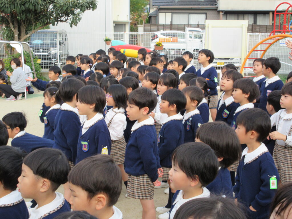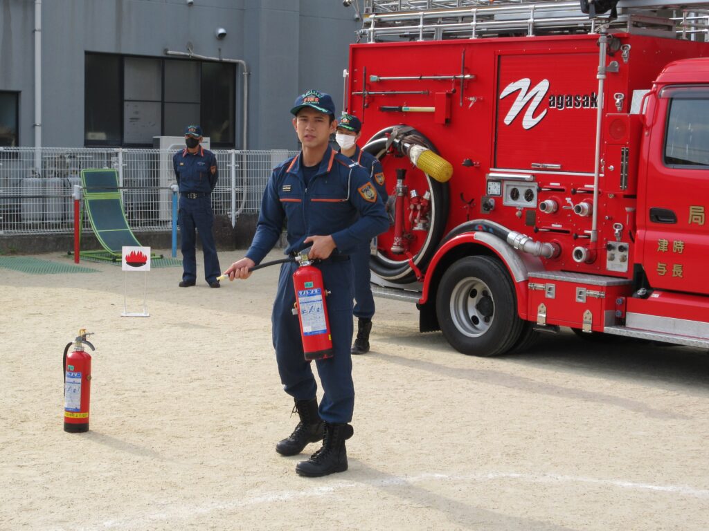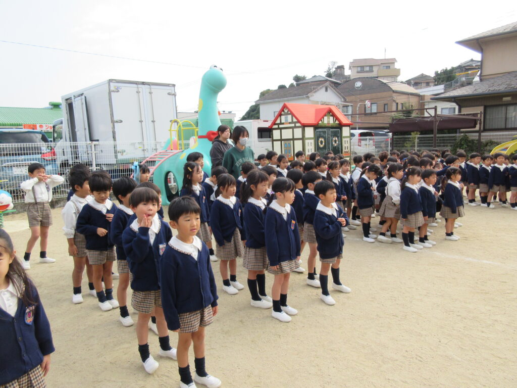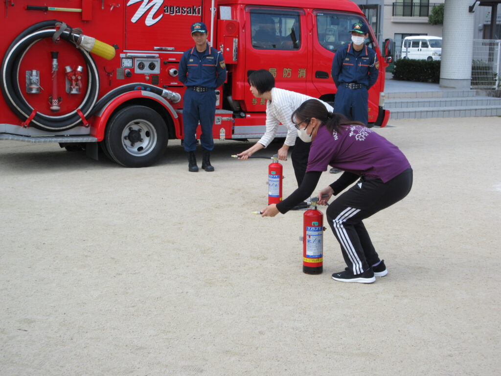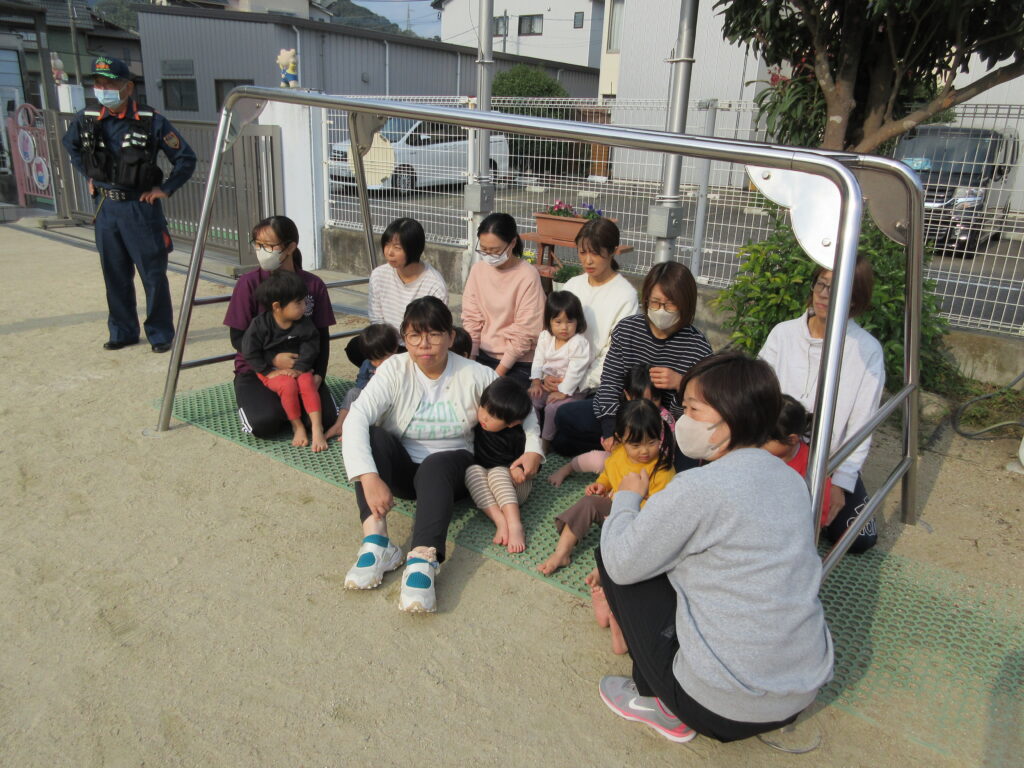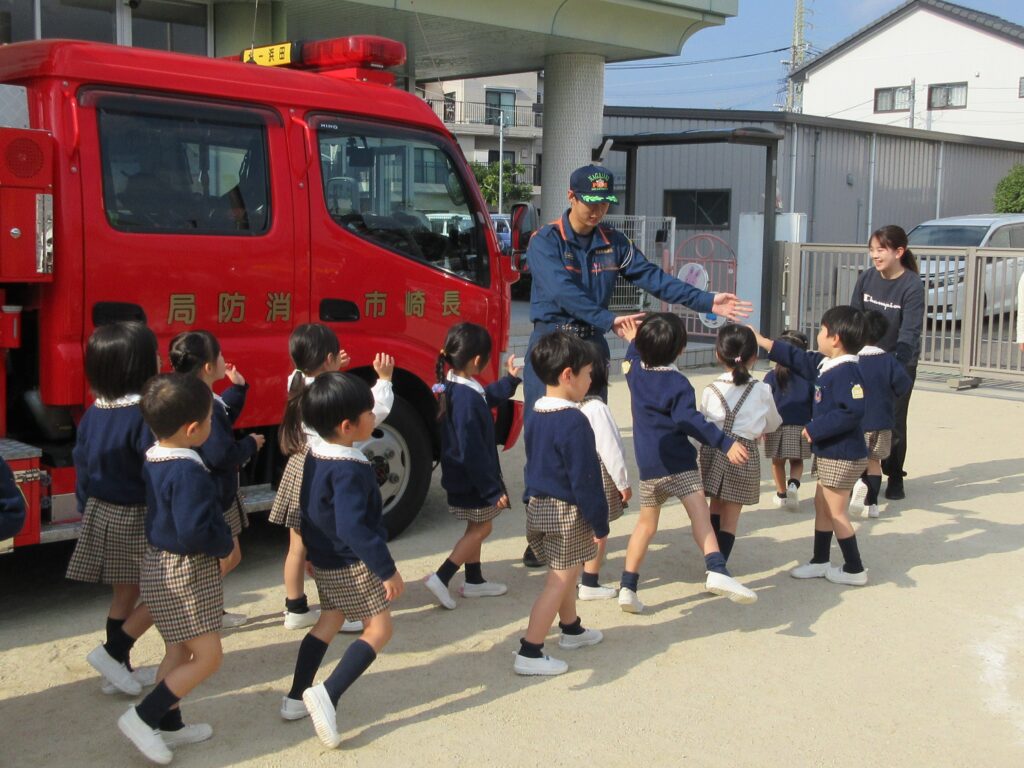 今日は、長崎北消防署浜田出張所の方に来ていただいて、火災の避難訓練を行いました。今回は、避難訓練をすることを子ども達には伝えていませんでしたが、落ち着いて避難することができました。
