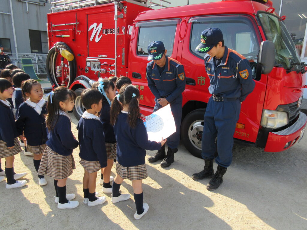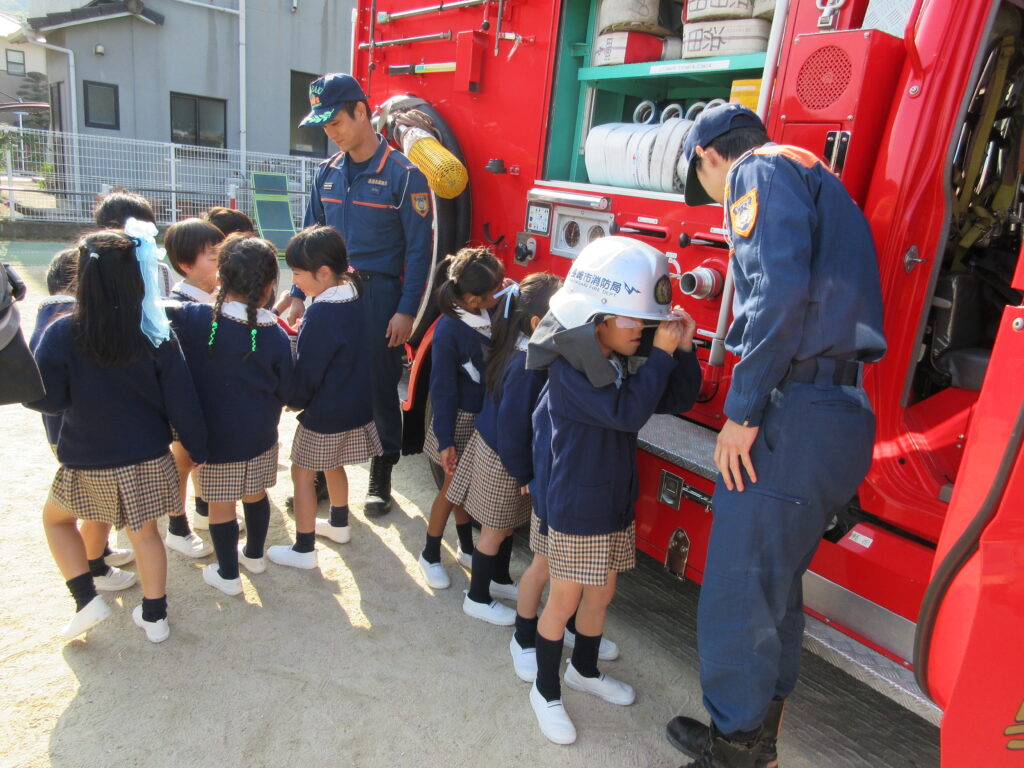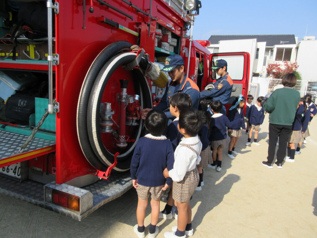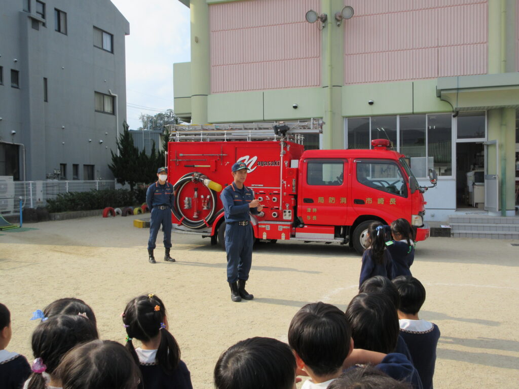 消防署の皆さん、お忙しい中避難訓練に来ていただきありがとうございました。消防車を見たり、消防士さんの話を聞いたりして、消防署の仕事の大切さを知ることができたと思います。