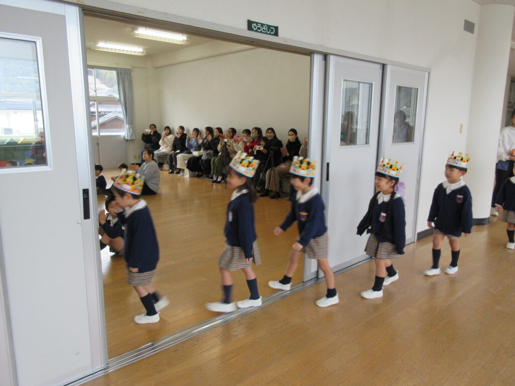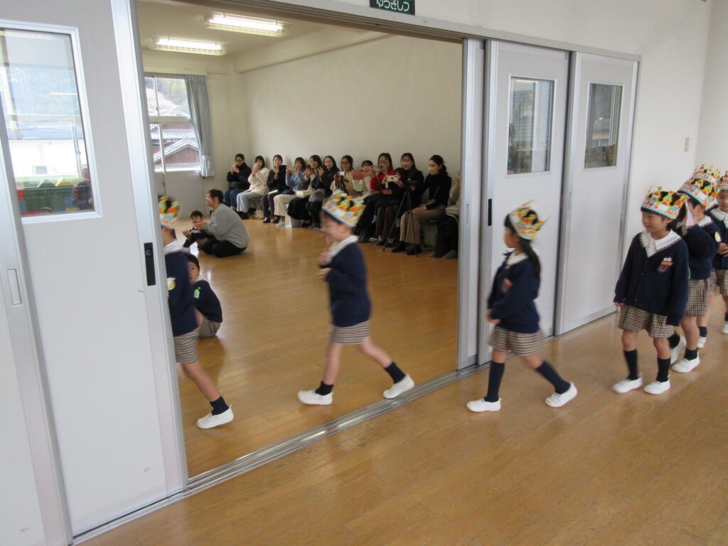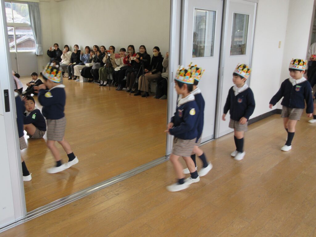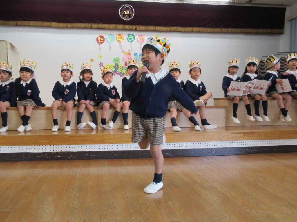 各クラスの発表です。すみれ組は、『チョコレート』の手遊びと『ゆげのあさ』というかわいい歌を歌いました♪