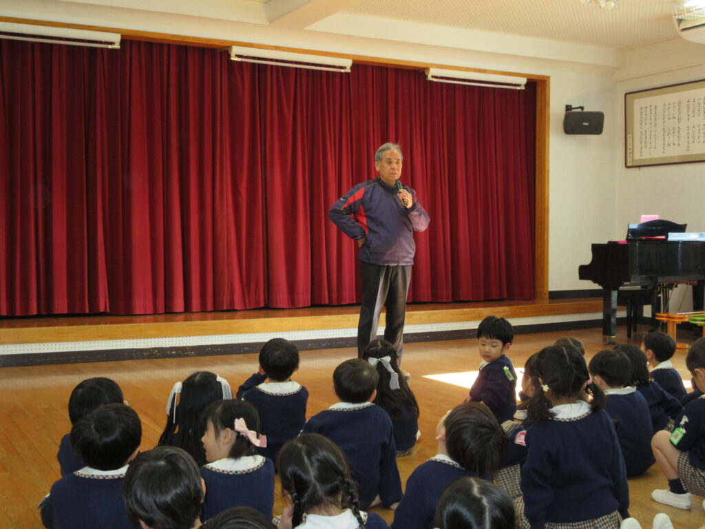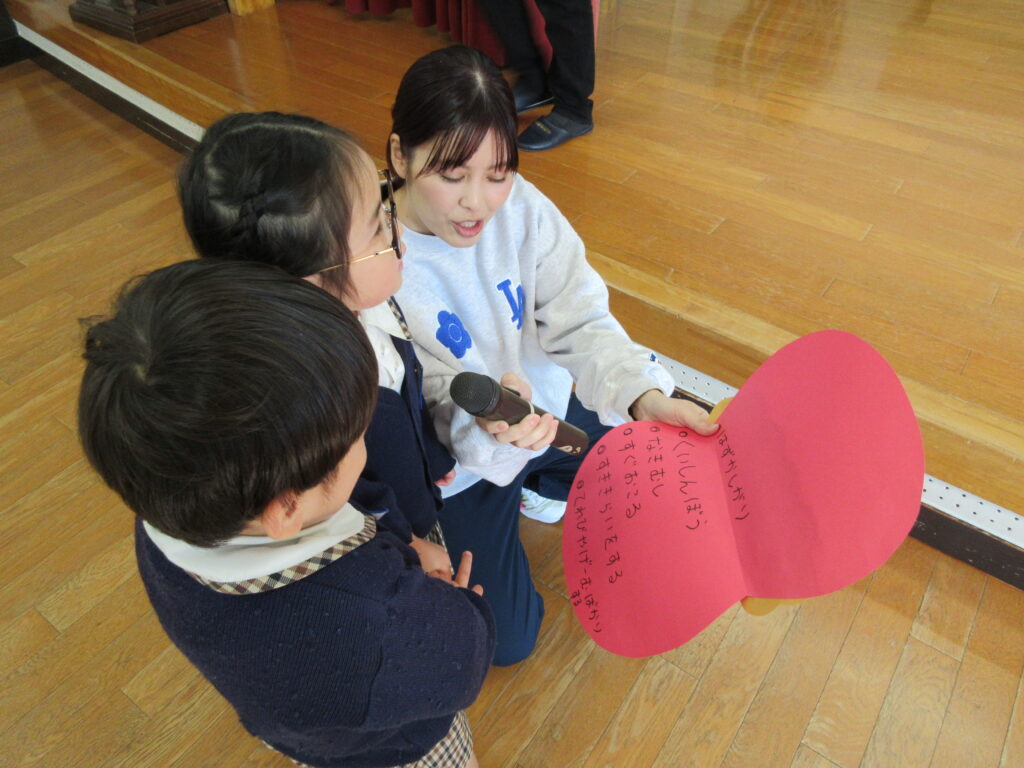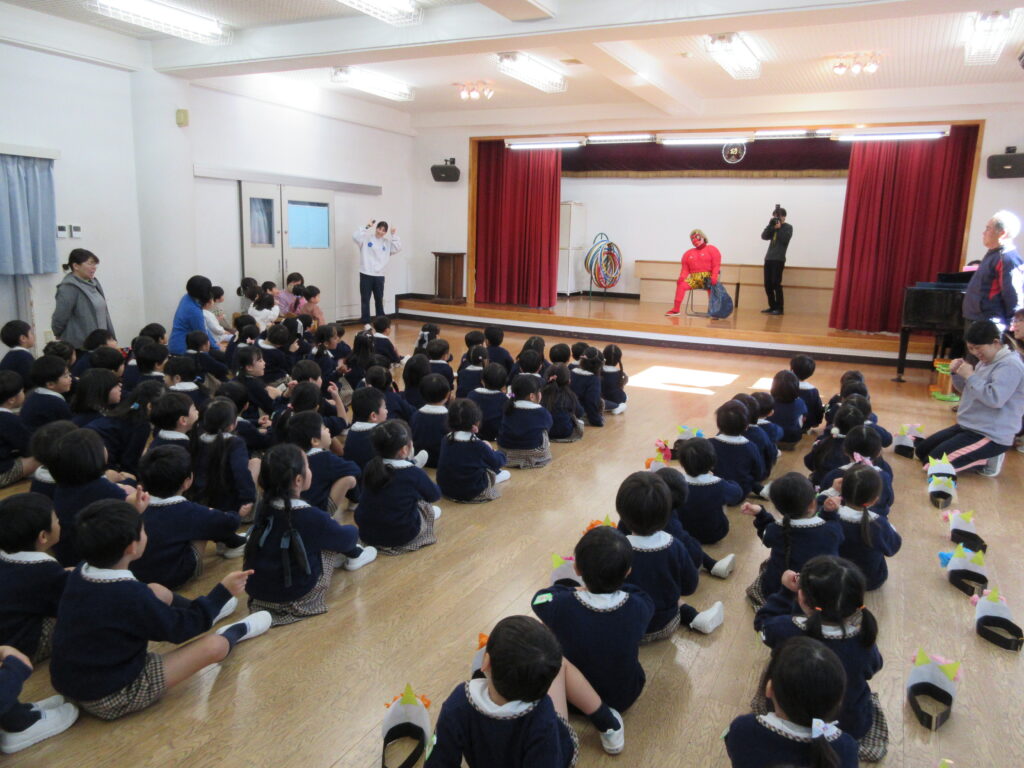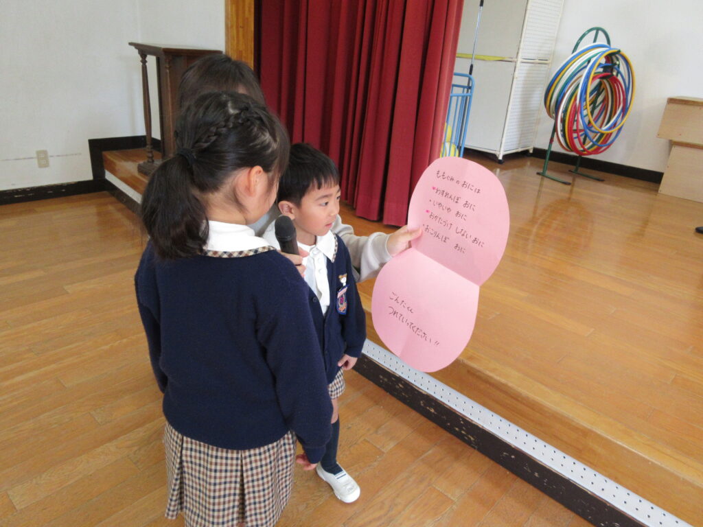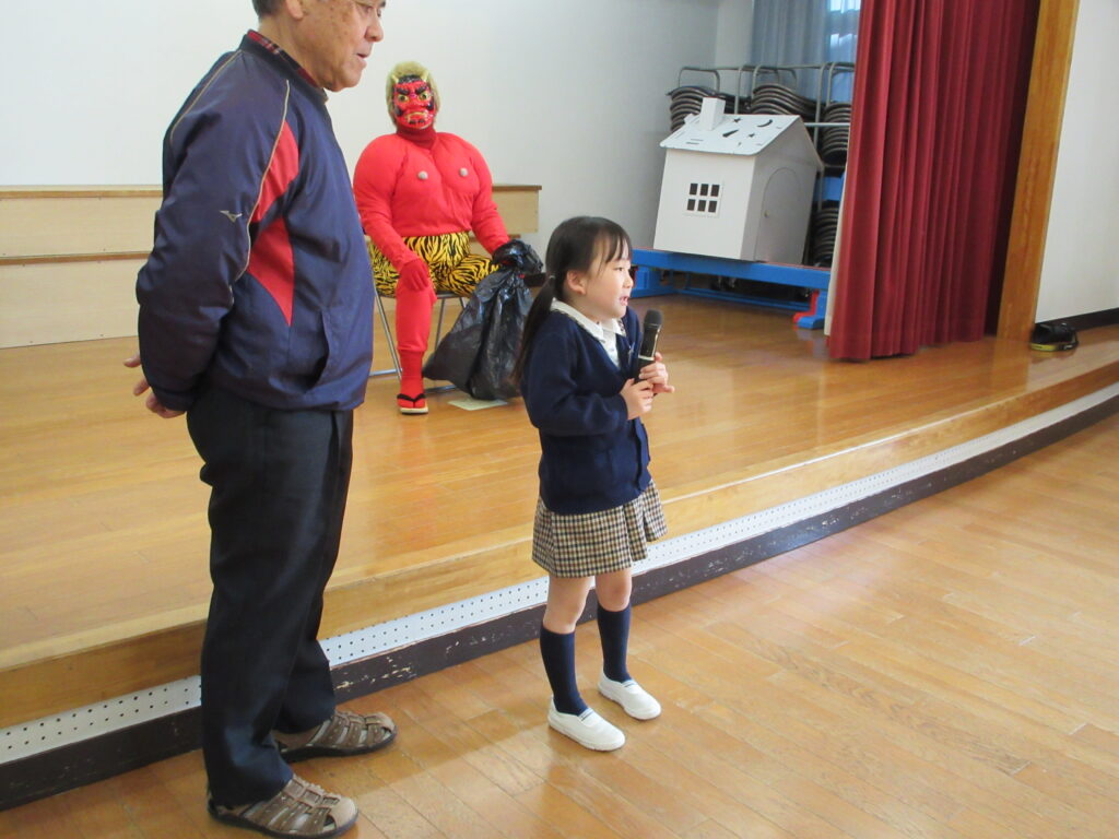 年長組の代表のお友だちが、ゴンタ君に質問をしました🎤「鬼の世界に幼稚園はありますか?」『おにっこ幼稚園という幼稚園があります。』 園長先生が聞いてくれました。