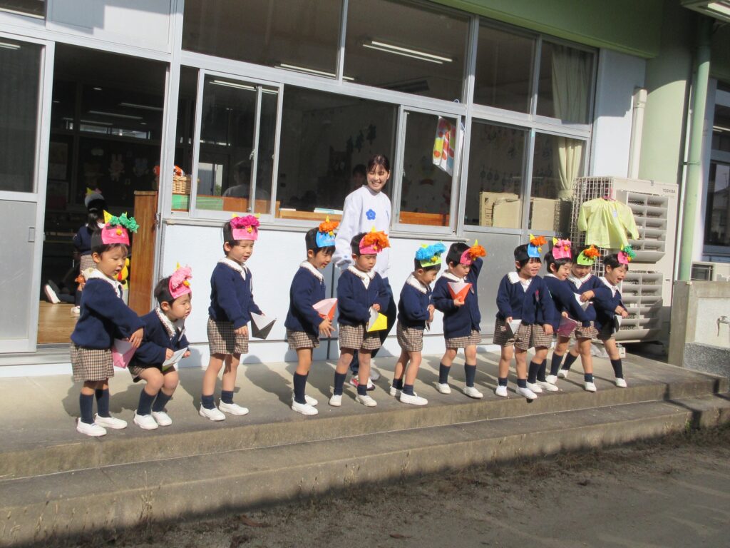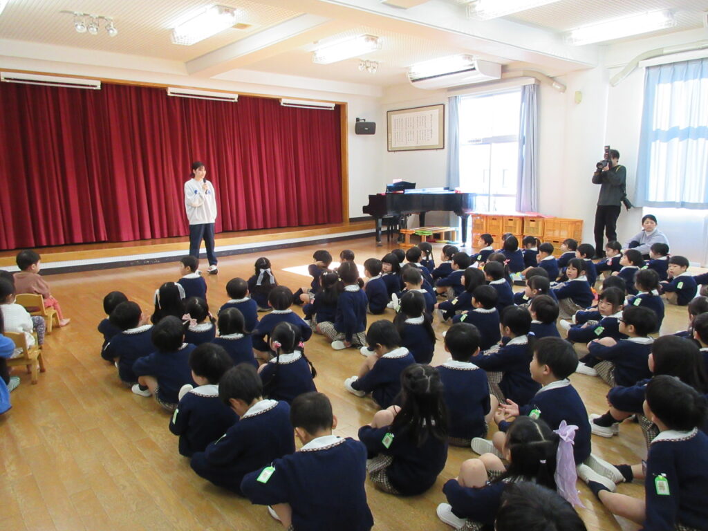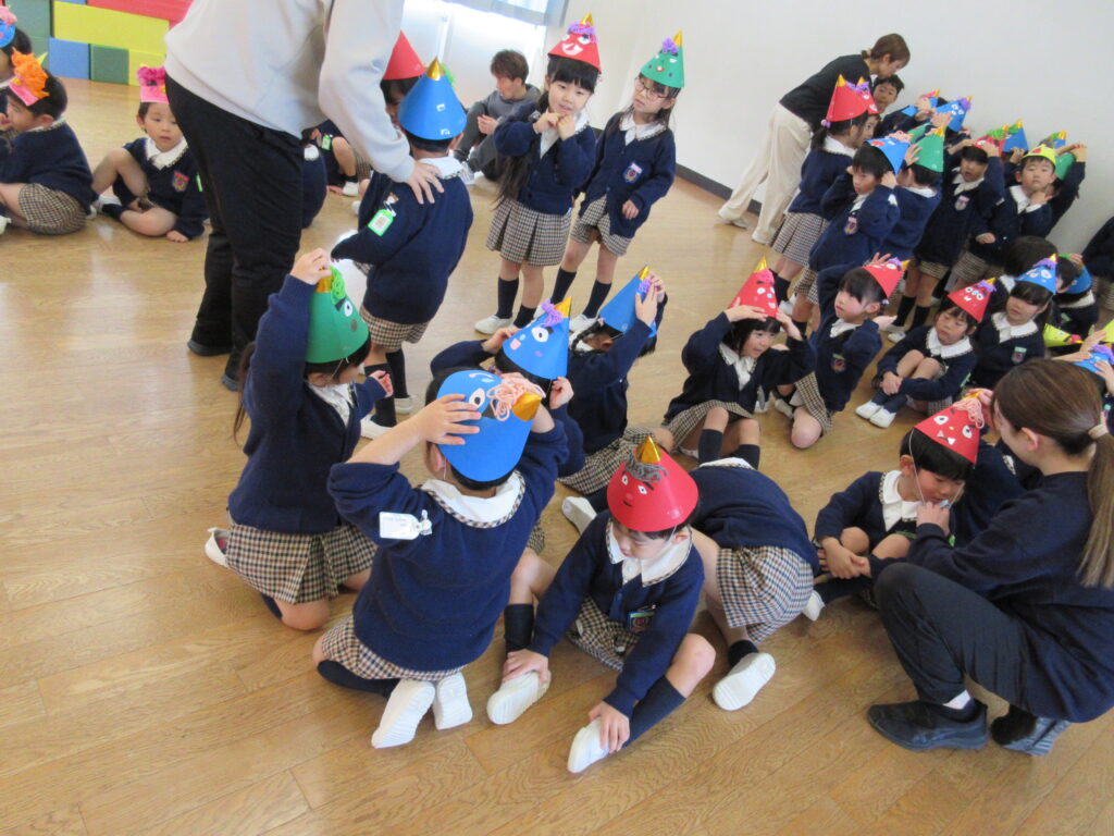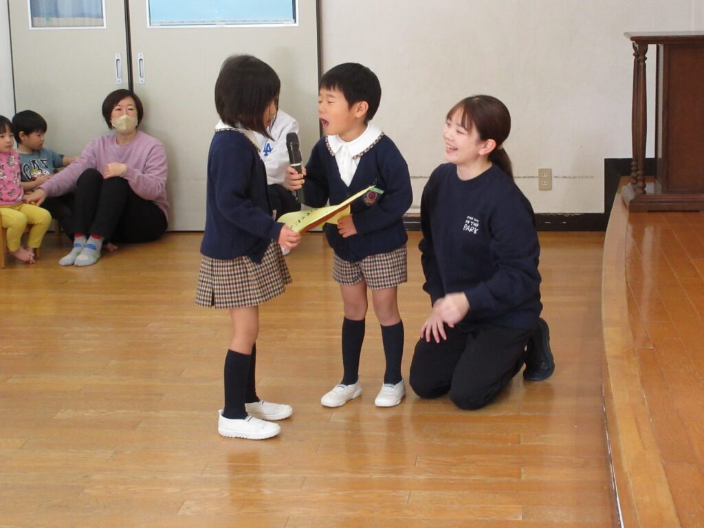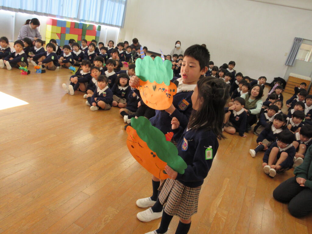 年長組の代表のお友だちが、ゴンタ君に質問をしました🎤「鬼の世界に幼稚園はありますか?」『おにっこ幼稚園という幼稚園があります。』 園長先生が聞いてくれました。
