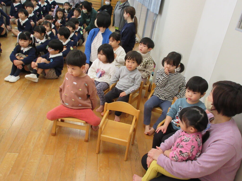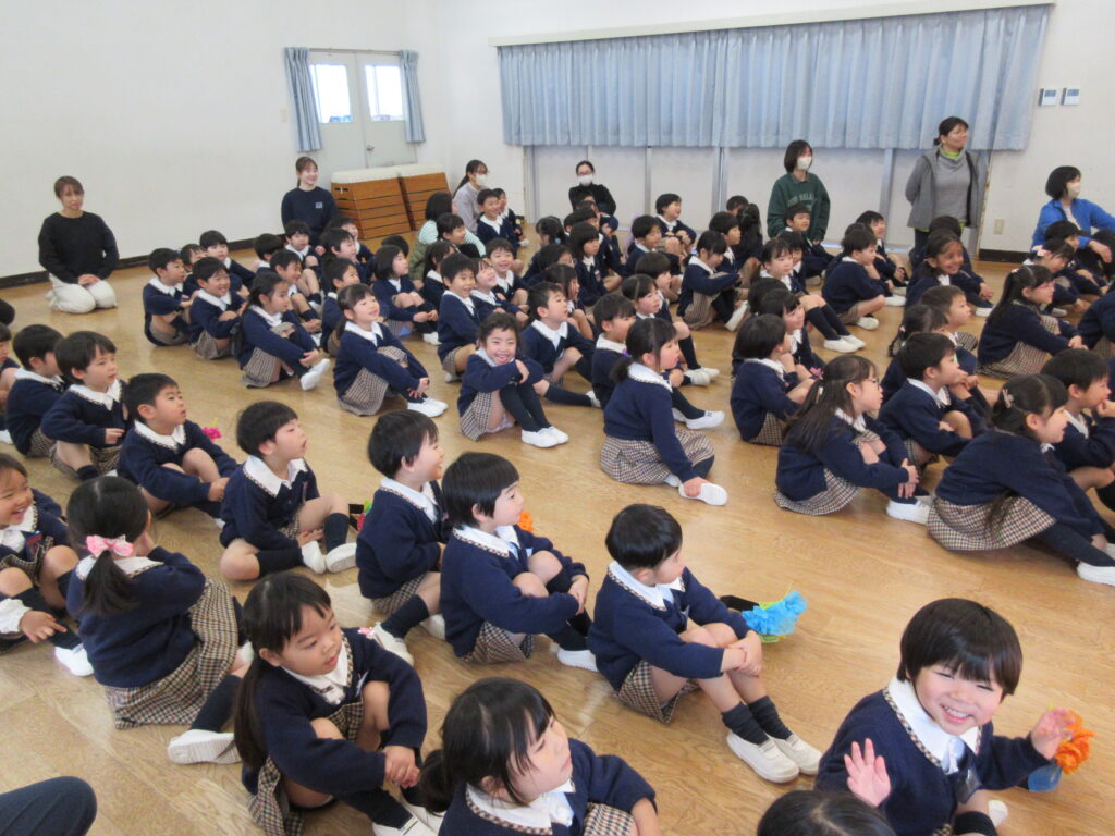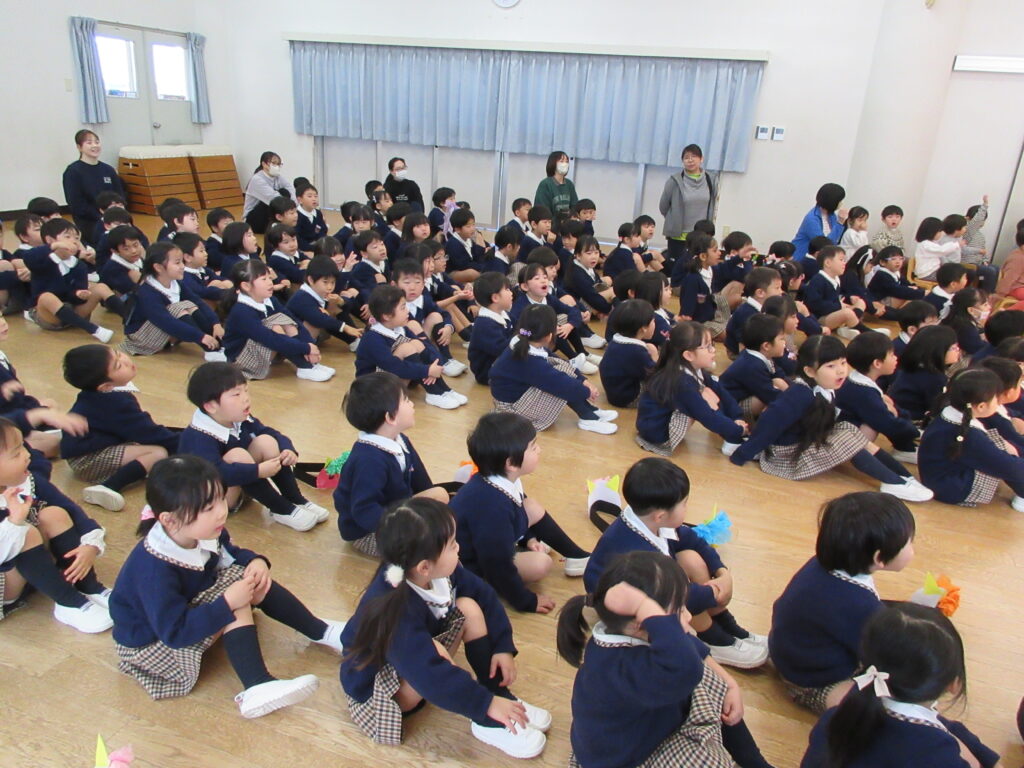 今日は、『節分の集い』ということで、全クラスおゆうぎ室に集まりました。朝から、「鬼のゴンタ君が来る!」とみんなソワソワしていました。