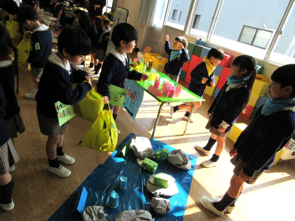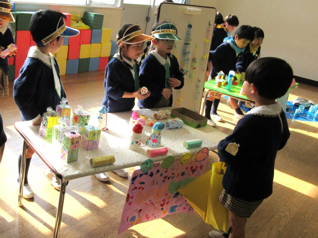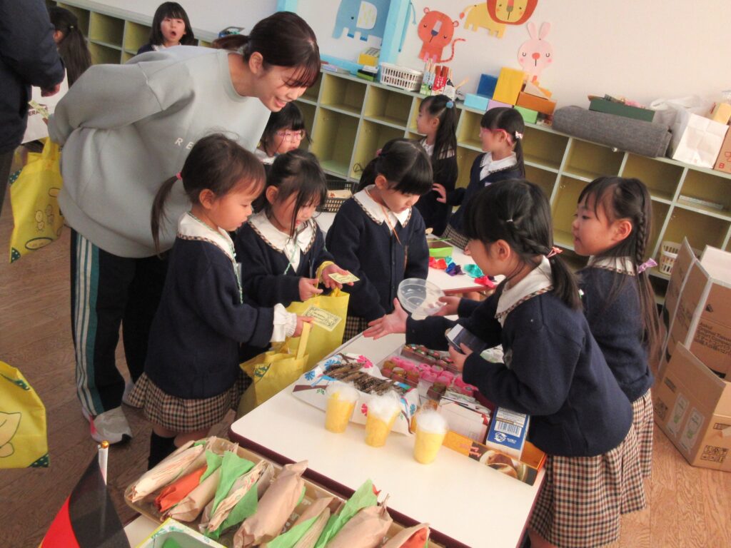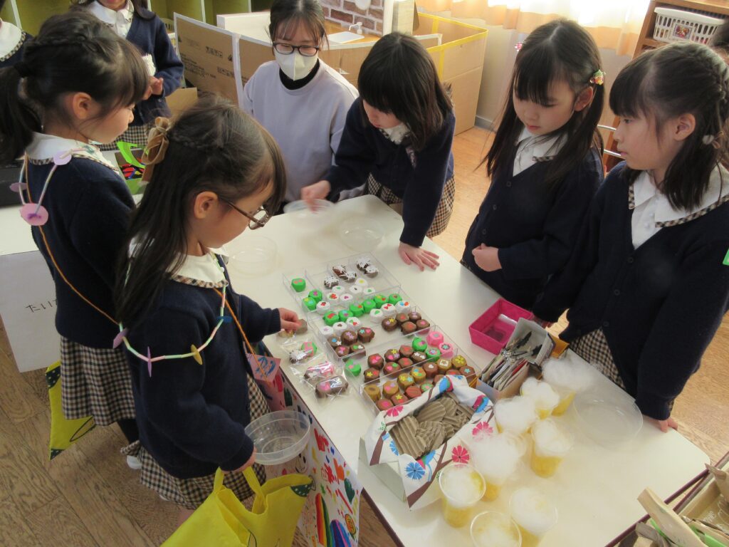 お店屋さんごっこは、究極のごっこ遊びです✨ どんなお店にするか考える、品物を工夫して作る、値段を決める、字や絵を書いてポスターを作る、売ったり買ったりする時の言葉を知るなど、各学年1年間やってきたことの集大成でがんばりました✨👏 みんないきいきと取り組んでいて、「楽しかった~!」とたくさんお土産を買って帰っていました。