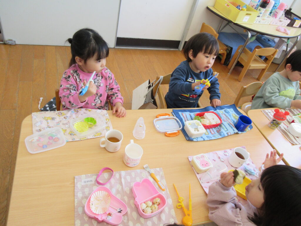 年少組のすみれ組のお友だちもこの1年で、食べられるものが増えて、お箸も上手に使うことができるようになりました🥢✨
